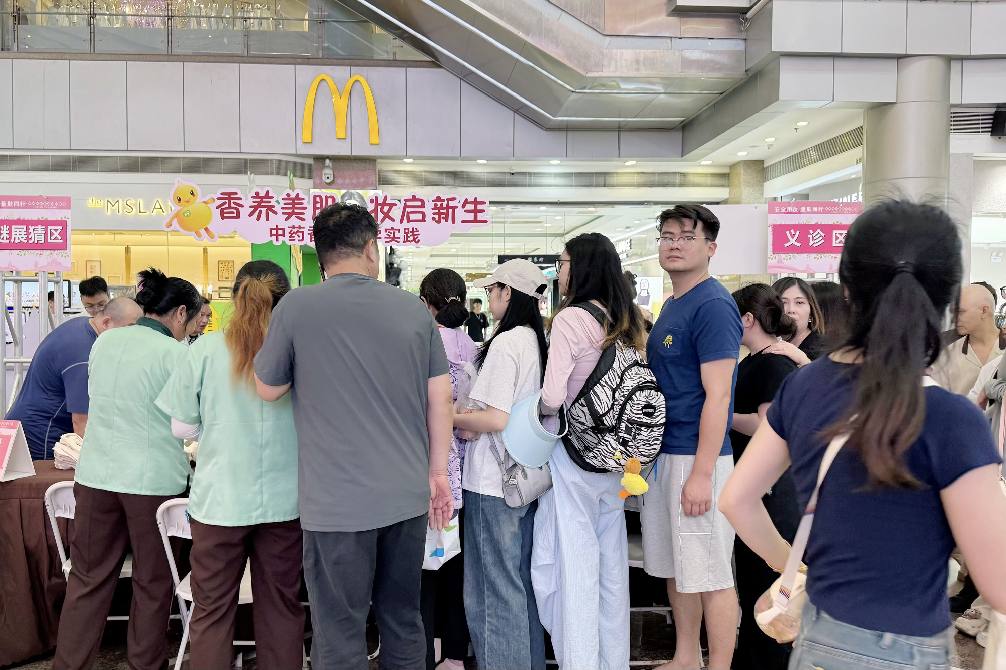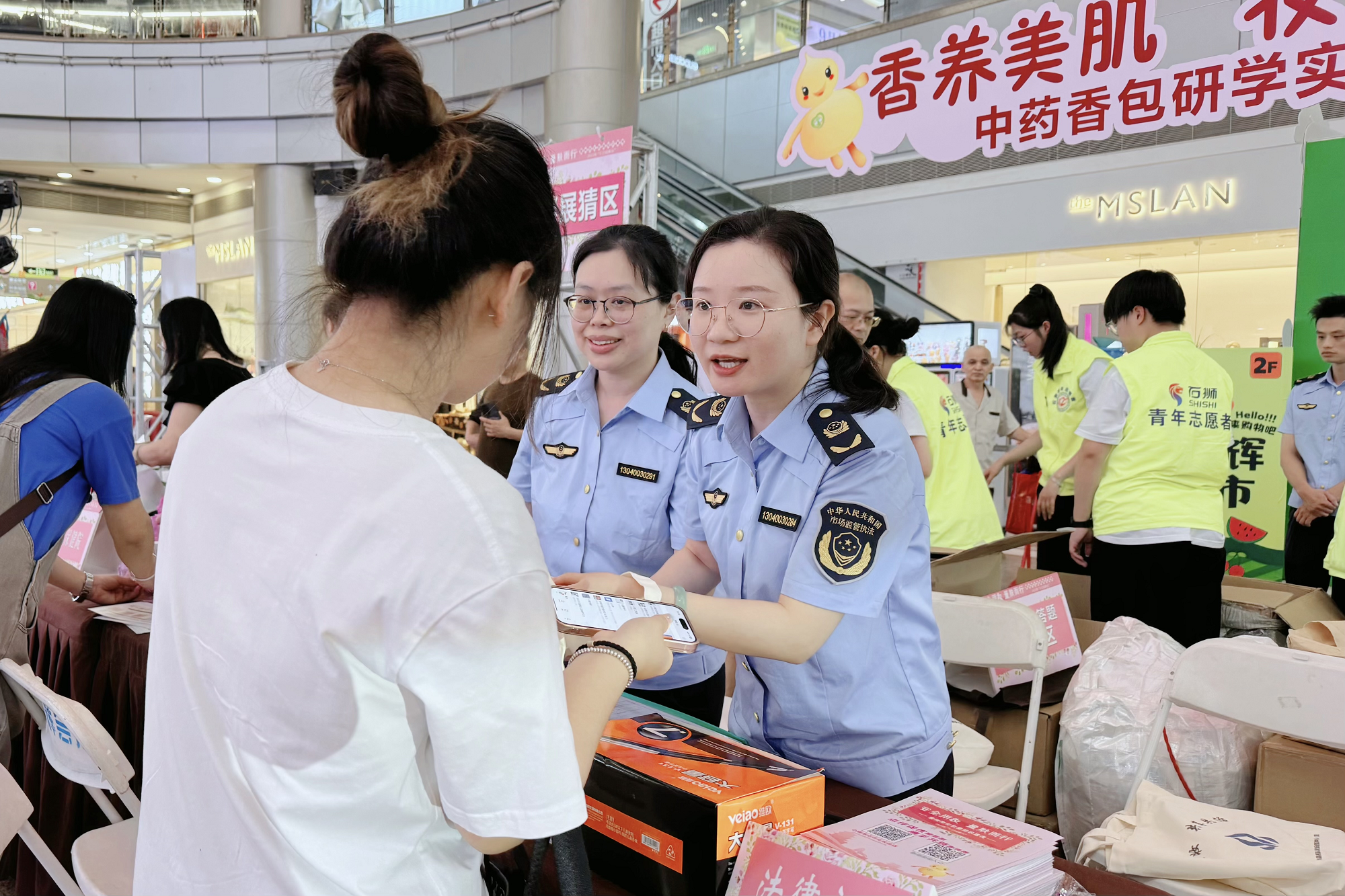 市场监管部门工作人员向群众和化妆品经营企业发放《化妆品知识宣传手册》及宣传品,科普安全用妆和不良反应知识;医疗机构专家为群众开展免费义诊、护肤指导和骨密度检查等服务。