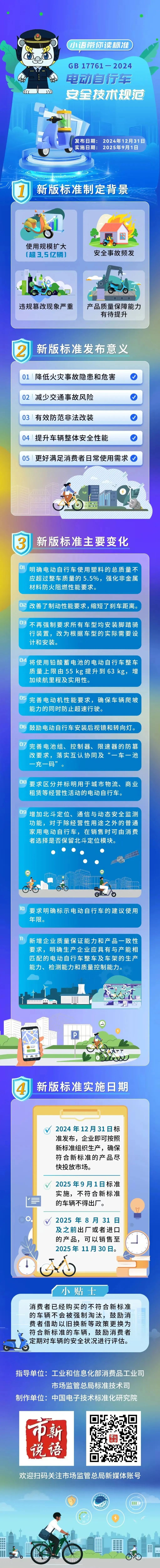 由工业和信息化部、即时赔率 会同公安部、应急管理部、国家消防救援局组织修订的强制性国家标准GB17761-2024《电动自行车安全技术规范》已于2024年12月31日正式发布,并将于2025年9月1日实施。新规针对电动自行车的整车标志、整车安全、机械安全、电气安全、防火阻燃、塑料占比、北斗定位功能、通信与动态安全监测、防篡改、使用说明书、企业质量保证能力和产品一致性等技术要求都有了一定的变化,一图带你快速了解↓↓↓
