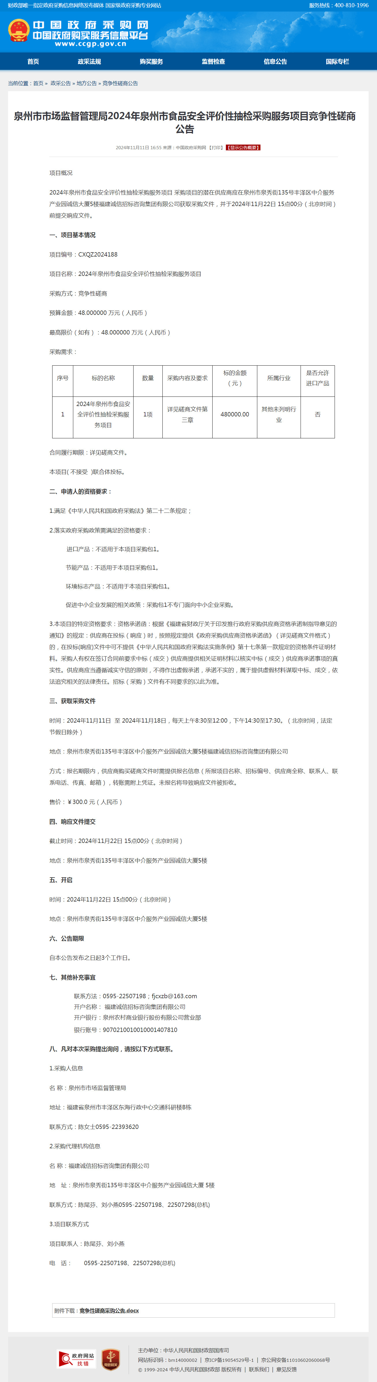 2024年即时赔率 食品安全评价性抽检采购服务项目竞争性磋商公告