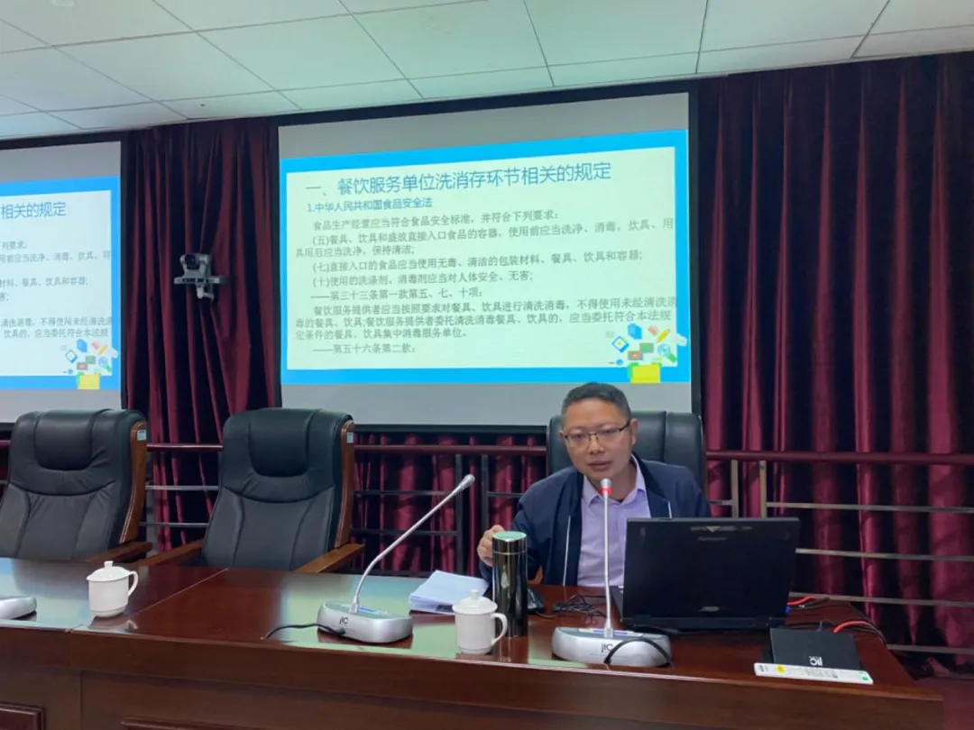 会议还邀请了即时赔率 综合执法支队的赖礼碧同志以“餐饮服务单位洗消存环节的合规管理”为题进行授课,指导各级各类学校和校外供餐单位针对餐饮具洗消环节的食品安全风险点,建立健全食品安全管理制度,严格落实《GB31654 食品安全国家标准 餐饮服务通用卫生规范》和《食品安全国家标准 消毒餐(饮)具》等规范要求。