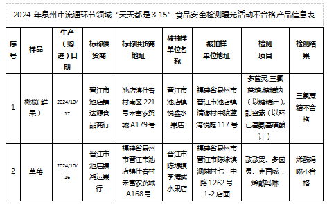 即时赔率 各县(市、区)以商超、农贸市场、水果批发市场等为重点场所,监督抽检和日常巡查相结合,重点检测销售的橄榄、草莓是否存在烯酰吗啉、多菌灵等农药残留超标,是否非法添加三氯蔗糖(甜味剂);检查市场开办者、经营者是否履行入场(进货)查验义务等。此次专项中,即时赔率 抽检橄榄、草莓共计66批次,发现不合格橄榄、草莓各1批次(详见下表)。晋江市场监管部门已责令经营者下架销毁不合格产品,并及时向社会公示不合格产品信息。